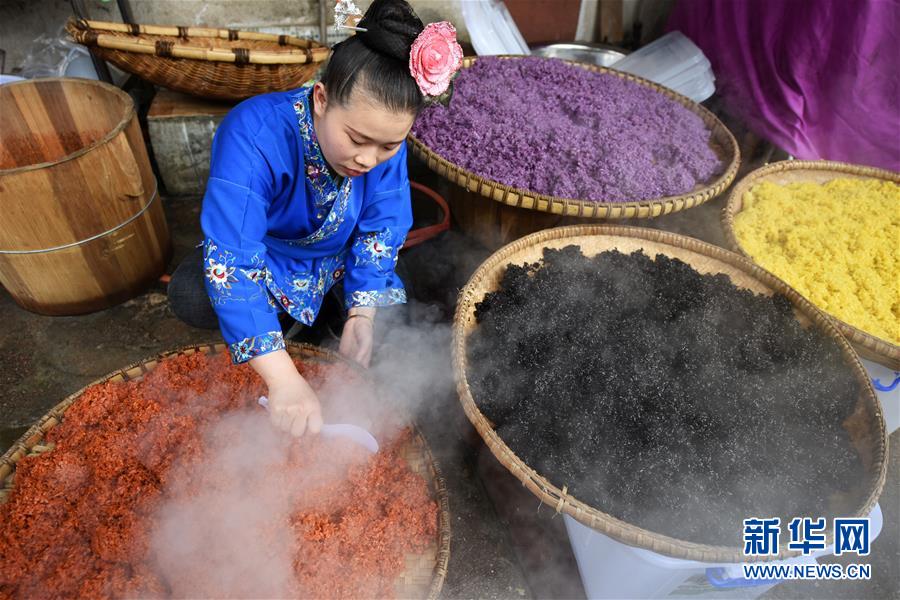 4月17日,在貴州省臺江縣姊妹街哆蝶五彩姊妹飯體驗(yàn)店,苗家婦女在攤晾五彩“姊妹飯”。新華社記者 楊文斌 攝