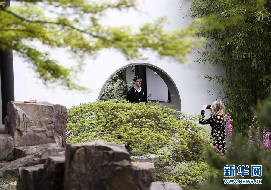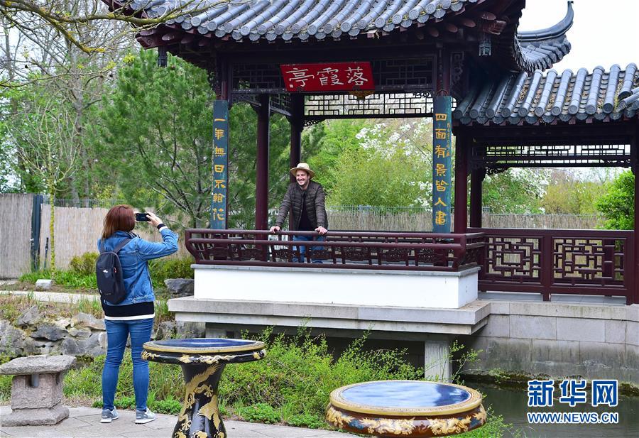 2019年4月13日,在德國曼海姆,游客在中式園林“多景園”內(nèi)拍照。“多景園”位于曼海姆市路易森公園內(nèi),占地約6000平方米,建筑面積約1500平方米,是目前歐洲最為完整的中國古典園林建筑群落之一。 新華社記者逯陽攝