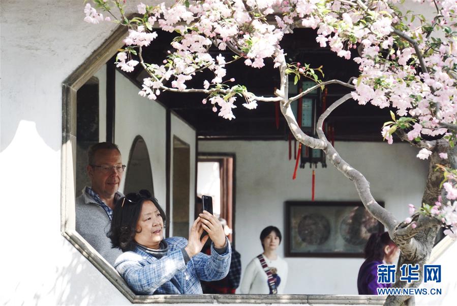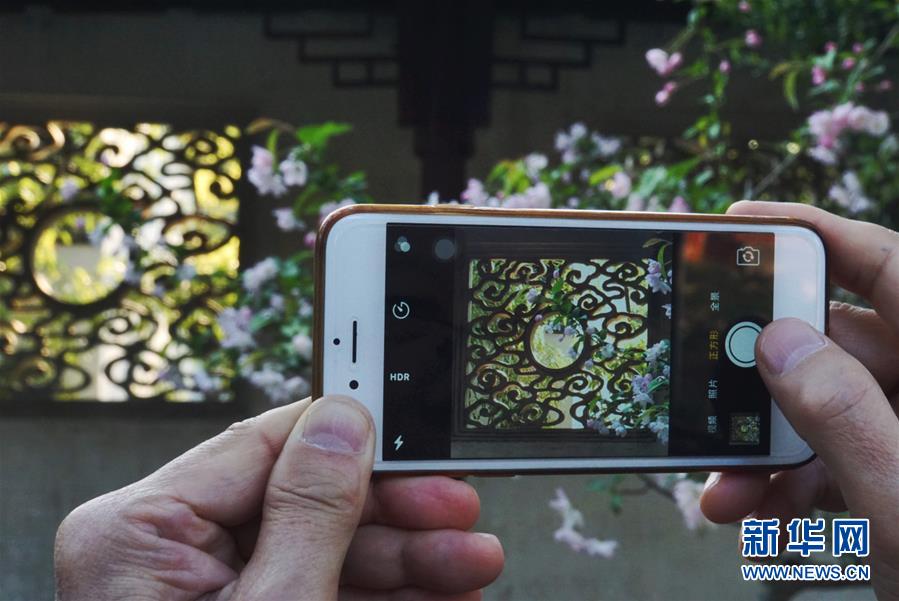 2019年4月1日,游客在中國蘇州網(wǎng)師園內(nèi)自拍。1997年,網(wǎng)師園和拙政園、留園、環(huán)秀山莊被列入聯(lián)合國教科文組織世界文化遺產(chǎn)名單。 新華社記者杜涓涓攝