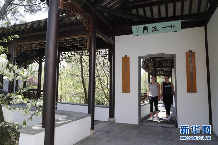 2017年4月28日,游客在美國紐約寄興園內(nèi)游覽。仿照中國蘇州園林設(shè)計(jì)建造的寄興園位于紐約斯塔滕島,占地面積約4000平方米,其所用的建筑材料大都在蘇州加工制造,并由40名來自蘇州的藝術(shù)家和工匠歷時(shí)6個(gè)月在紐約修建而成。 新華社記者王迎攝