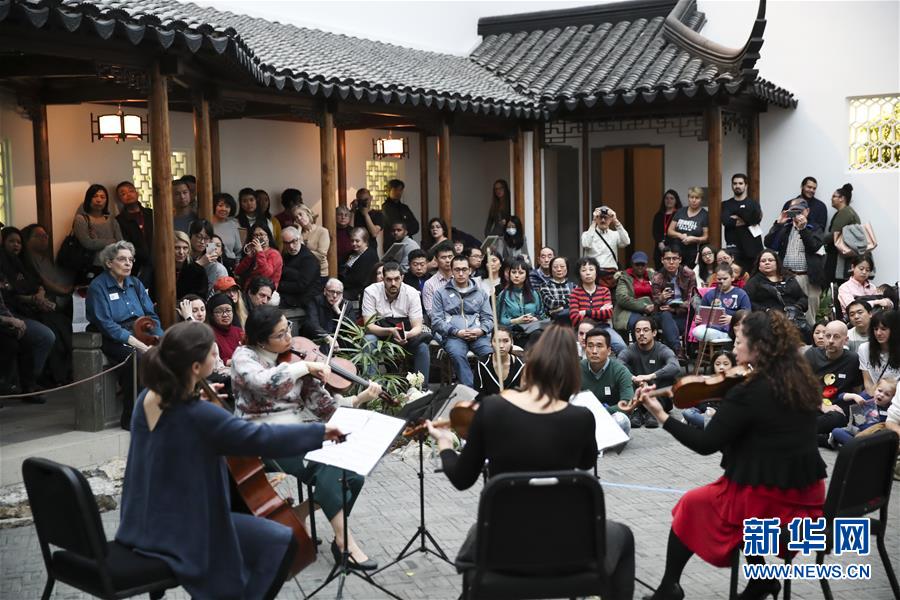 2018年2月24日,人們在美國紐約大都會博物館“明軒”欣賞演出,慶祝新春佳節(jié)。中式庭院“明軒”是中國第一個(gè)落戶海外的蘇式園林,位于美國紐約大都會博物館二層的玻璃天棚下,是模仿中國蘇州網(wǎng)師園中的“殿春簃”設(shè)計(jì)建造而成的?!懊鬈帯庇商K州市園林管理局承建,所用的磚、瓦、木材、構(gòu)件等在中國備好后,由20余名中國工程師和工匠在美國組裝。 新華社記者王迎攝