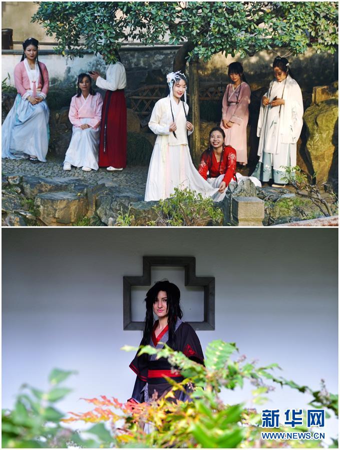 這張拼版照片展示的是:上圖,2019年4月1日,游客在中國蘇州耦園內(nèi)身著古裝拍照(新華社記者杜涓涓攝);下圖,2019年4月13日,一名當(dāng)?shù)赜慰驮诘聡D分惺綀@林“多景園”內(nèi)身著古裝拍照(新華社記者逯陽攝)。