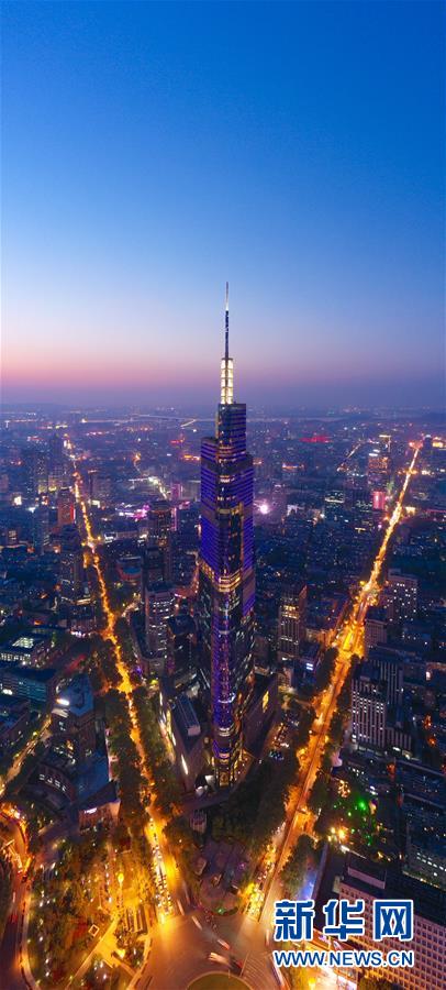 這是4月17日無(wú)人機(jī)拍攝的南京紫峰大廈和城市夜景。 新華社記者 李博 攝
