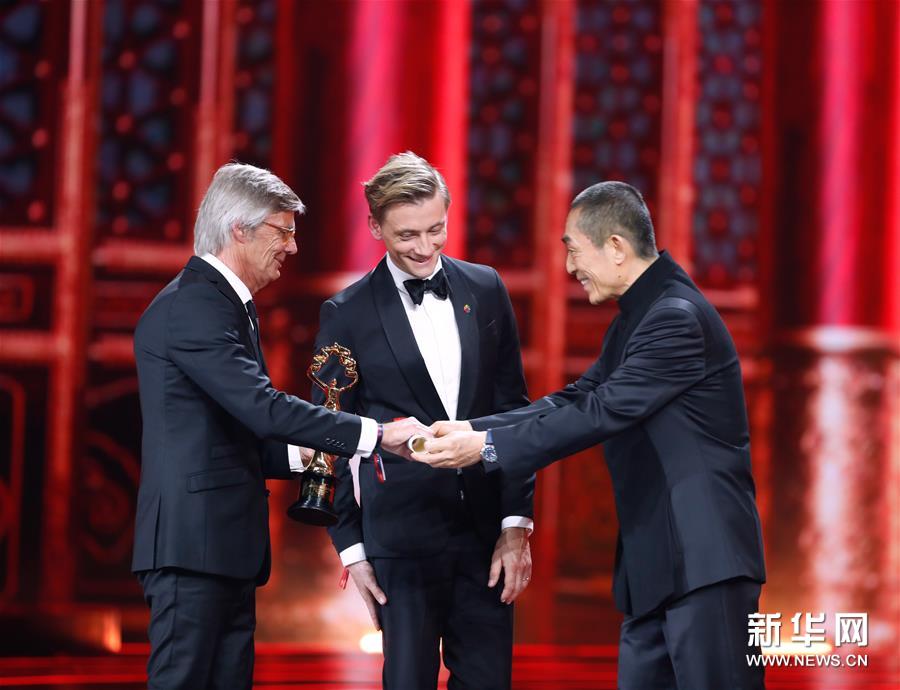 4月20日,影片《幸運(yùn)兒彼爾》獲得“天壇獎(jiǎng)最佳影片獎(jiǎng)”,張藝謀(右)為領(lǐng)獎(jiǎng)?wù)撸ㄗ螅╊C獎(jiǎng)。 當(dāng)日,第九屆北京國際電影節(jié)閉幕式暨頒獎(jiǎng)典禮在北京懷柔國家中影數(shù)字制作基地舉行。 新華社記者 沈伯韓 攝