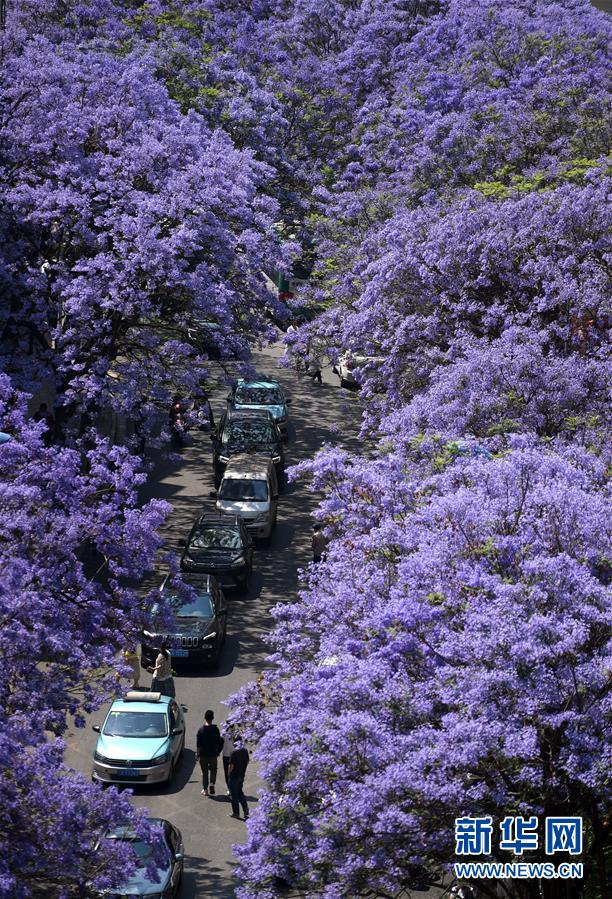 昆明市教場中路一帶的藍(lán)花楹進(jìn)入盛花期(4月24日攝)。近日,云南昆明市不少街區(qū)的藍(lán)花楹相繼開放,為美麗春城增添了一處處風(fēng)景。 新華社記者秦晴攝