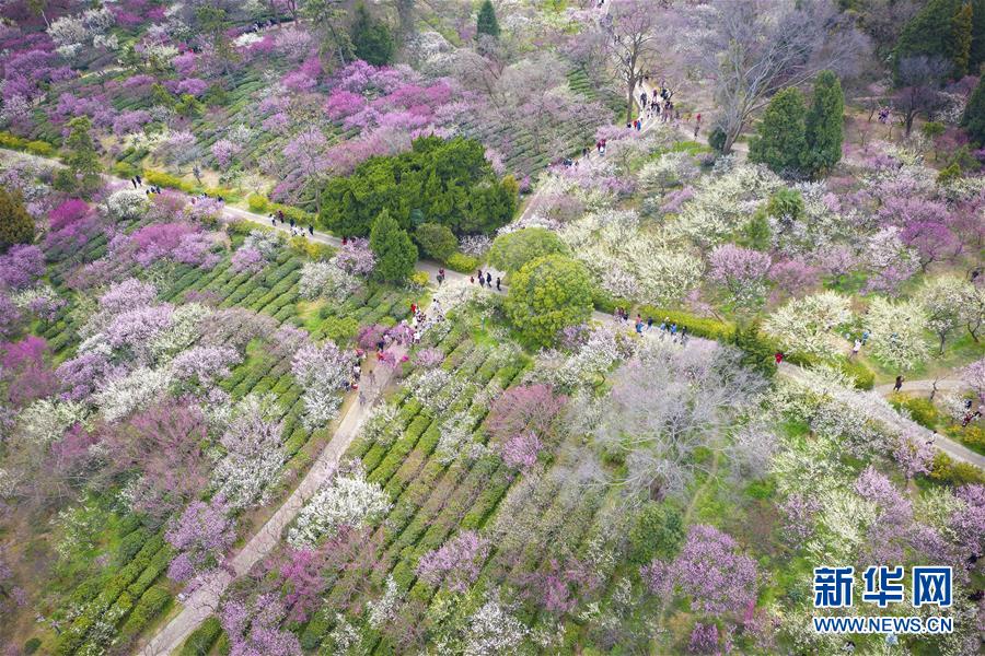 游客在江蘇南京梅花山賞花(3月8日無人機(jī)拍攝)。 新華社發(fā)(蘇陽 攝)