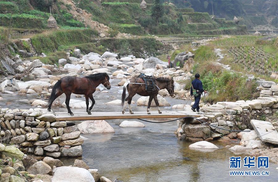 在黔桂烏英苗寨,村民牽馬上山勞作(2017年11月10日攝)。 新華社記者 黃孝邦 攝