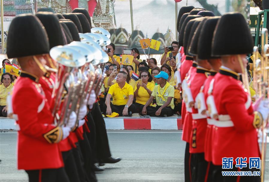 5月5日,儀仗隊(duì)在曼谷大王宮附近舉行的泰國國王加冕典禮巡游上列隊(duì)前進(jìn)。  新華社記者 張可任 攝