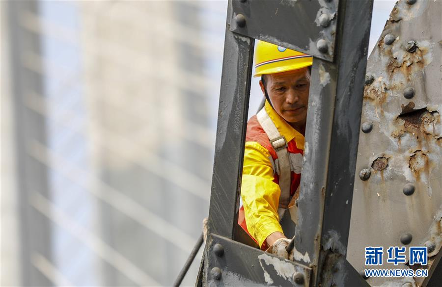 中國(guó)鐵路成都局有限公司重慶工務(wù)段53歲的橋隧工唐金華在白沙沱長(zhǎng)江大橋的鋼架上檢查鋼梁的銹蝕情況(4月23日攝)。 4月23日下午5點(diǎn)40分,隨著重慶白沙沱長(zhǎng)江大橋通行的最后一列客運(yùn)列車(chē)順利通過(guò),這座“服役”了59年的重慶首座長(zhǎng)江大橋進(jìn)入“退役”倒計(jì)時(shí)。4月24日后,所有列車(chē)將改線經(jīng)距白沙沱長(zhǎng)江大橋約100米的新白沙沱長(zhǎng)江特大橋通行,新橋“接力”老橋,運(yùn)輸能力將得到大幅提升。 白沙沱長(zhǎng)江大橋于1958年開(kāi)工,1960年通過(guò)首趟列車(chē),是繼武漢長(zhǎng)江大橋之后的第二座長(zhǎng)江大橋。 新華社記者 劉潺 攝