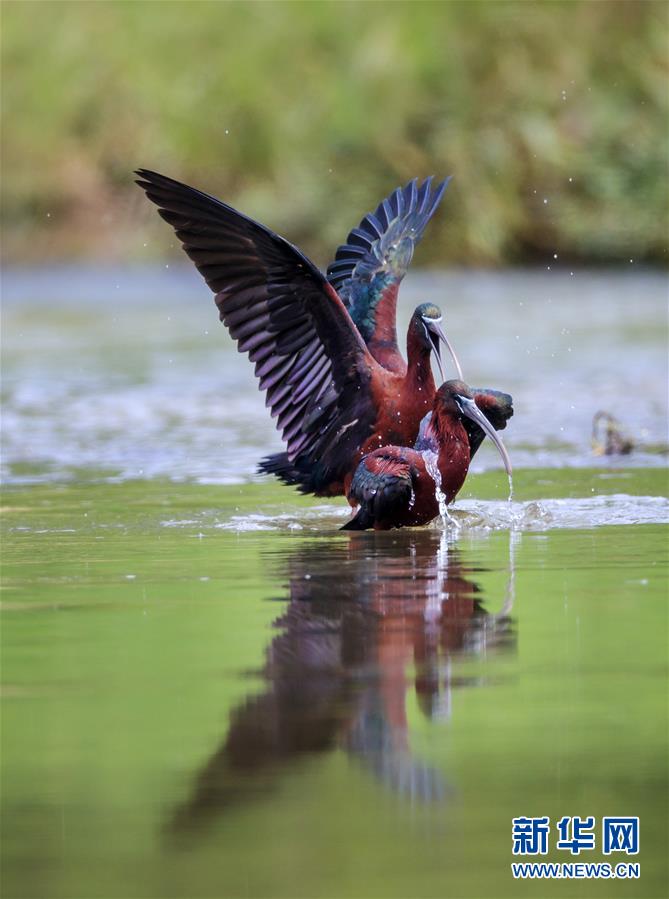 這是在漢江濕地公園嬉水的2只彩鹮(5月4日攝)。 近日,國(guó)家二級(jí)保護(hù)動(dòng)物彩鹮現(xiàn)身陜西省漢中市漢江濕地公園濂水河與漢江交匯處。 據(jù)陜西師范大學(xué)生命科學(xué)院教授于曉平介紹,彩鹮在世界上的分布比朱鹮還要少,這幾年在云南發(fā)現(xiàn)得多一些,這3只彩鹮現(xiàn)身漢江濂水河畔,是陜西首次發(fā)現(xiàn)彩鹮蹤跡。 據(jù)了解,彩鹮是國(guó)家二級(jí)保護(hù)動(dòng)物,屬鵜形目鹮科,體羽大部為青銅栗色,是珍稀鳥(niǎo)類(lèi)朱鹮的“近親”,體型比朱鹮略小。 新華社發(fā)