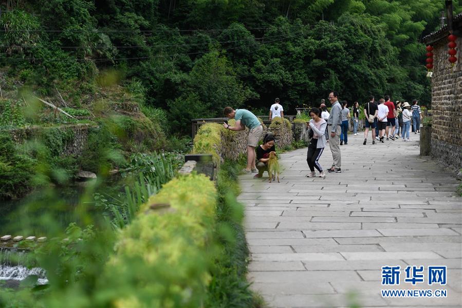 中外游客在石舍村游覽(5月25日攝)。 石舍村是浙江省桐廬縣富春江鄉(xiāng)村慢生活體驗區(qū)中的三個村落之一,位置偏僻,依溪而居,風(fēng)景秀美。近年來,石舍村結(jié)合古建筑保護(hù)工作,在清潔、美化村莊的基礎(chǔ)上,對一些廢棄古建筑進(jìn)行修繕,引入咖啡館、民宿等文化創(chuàng)意類項目,優(yōu)良的生態(tài)環(huán)境和濃郁的文化氛圍吸引大批游客前來體驗,小山村走上了一條發(fā)展美麗經(jīng)濟(jì)之路。2018年,石舍村接待游客10萬8千余人次,旅游經(jīng)營凈收入1260余萬元。 新華社記者 黃宗治 攝