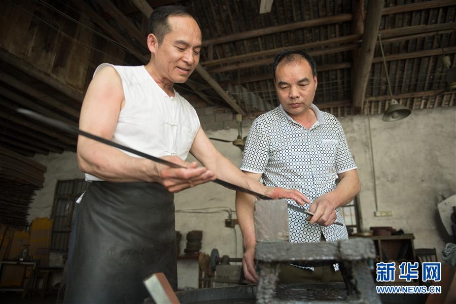 5月21日,鄭國榮(左)和磨劍師吳長友交流磨劍細節(jié)。吳長友是鄭國榮在國營劍廠的老同事,跟隨鄭鑄劍20余年。 新華社記者 翁忻旸 攝