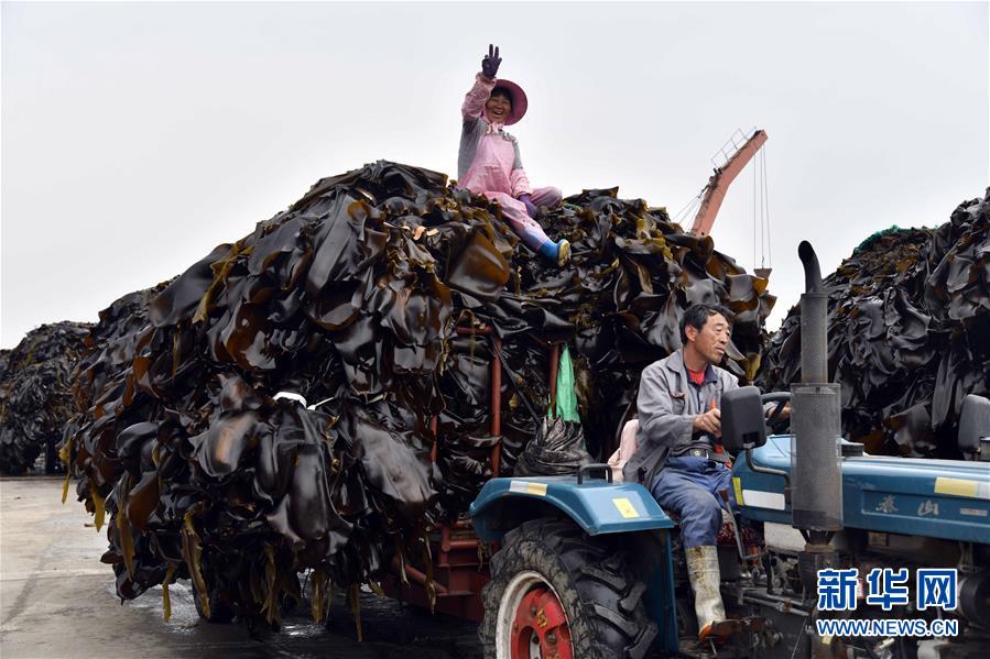 6月5日,在榮成市尋山街道青魚灘村,漁民在收獲海帶。 近日,山東省榮成市迎來海帶收獲季。據(jù)悉,榮成市海帶養(yǎng)殖面積14.5萬畝,年產(chǎn)海帶43.3萬噸以上。 新華社記者郭緒雷攝