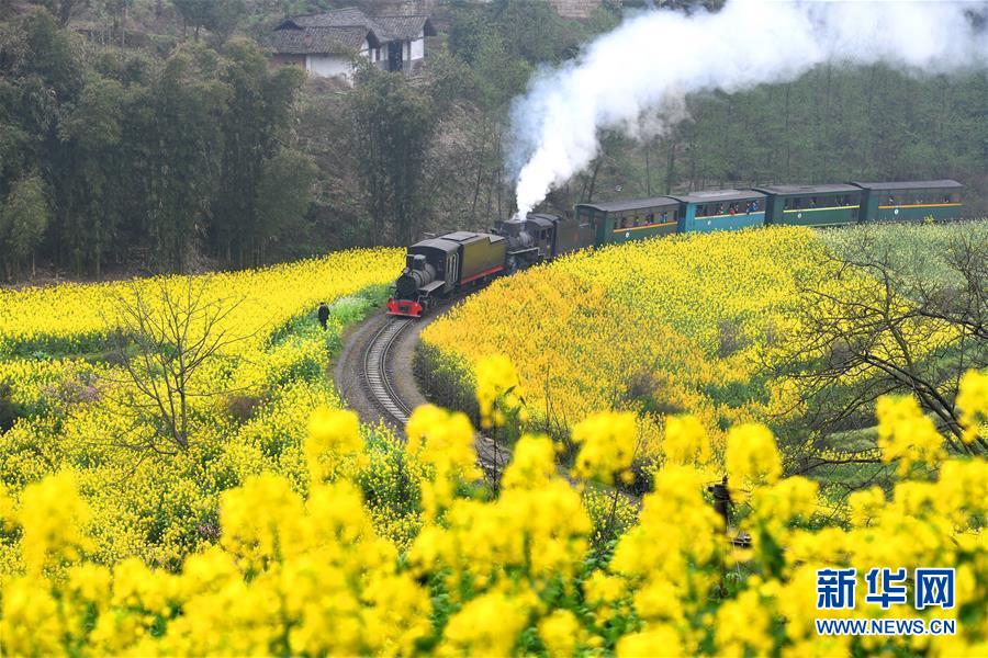 3月20日,一列嘉陽(yáng)小火車(chē)在油菜花叢中穿行。