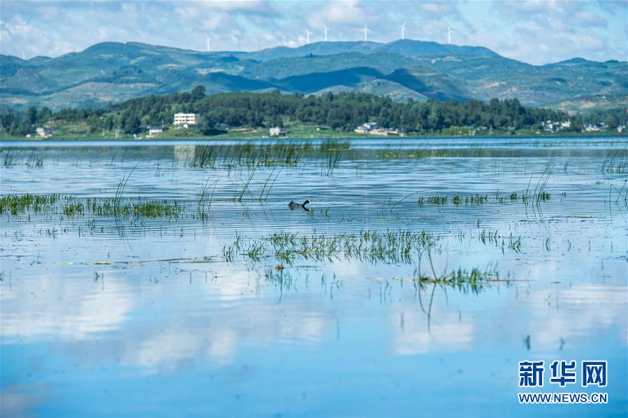 草海國(guó)家級(jí)自然保護(hù)區(qū),一只白骨頂雞在水面游弋(6月20日攝)。 新華社記者 陶亮 攝
