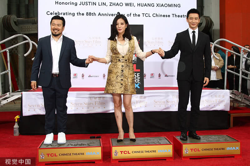 趙薇和黃曉明在好萊塢TCL中國大劇院門前按下象征世界電影人無上榮譽的手印,在該地留印的華人明星只有三個,分別是成龍、吳宇森和馮小剛。