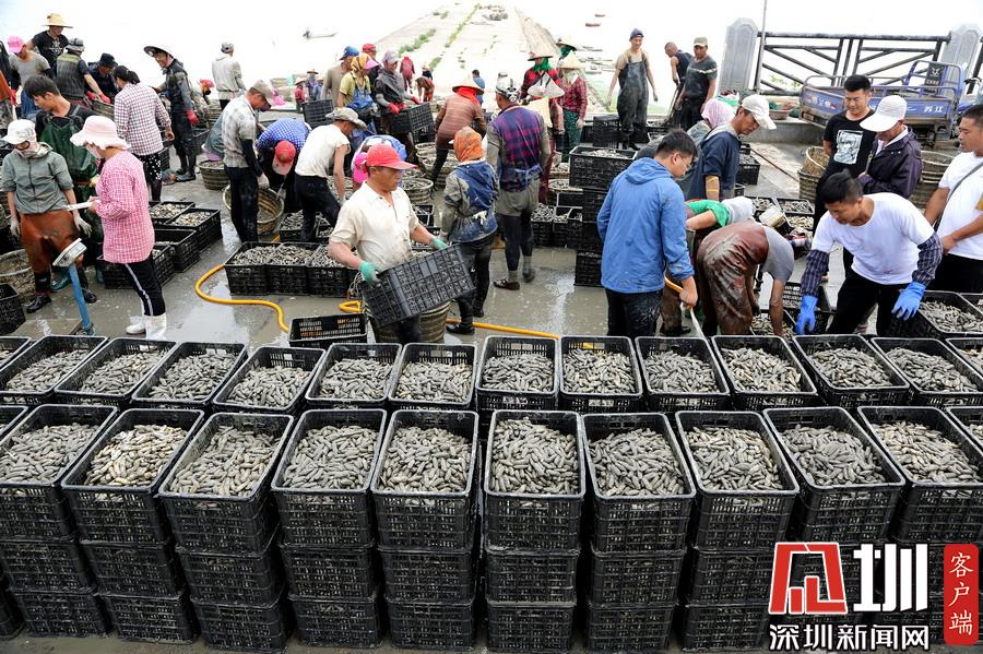 2019年7月9日,漁民們在江蘇連云港沿海地區(qū)海邊的灘涂上將剛收獲的海蟶運送上岸裝箱外運。