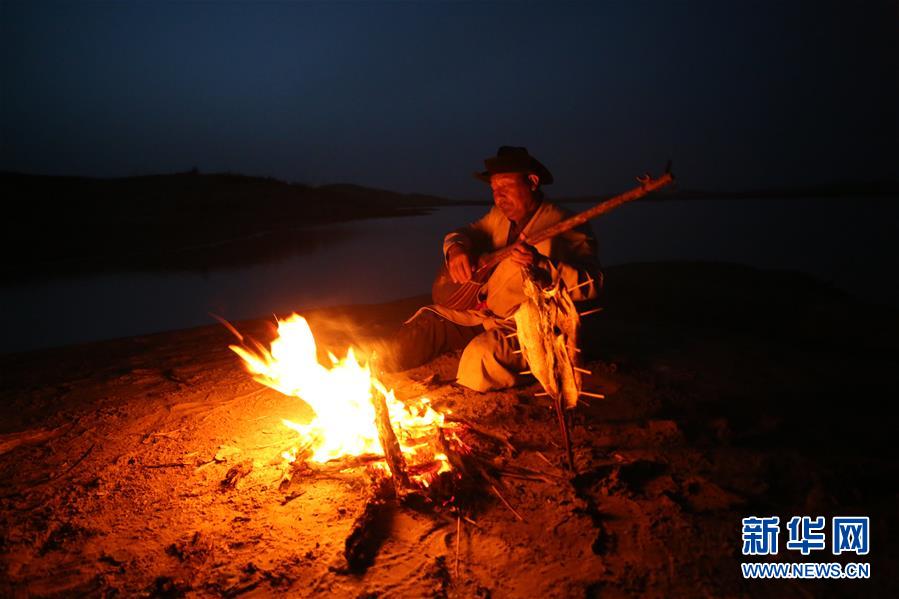 在羅布人村寨,阿木東·艾不東在沙漠里的一處海子旁彈奏樂器,等待烤魚烤熟(4月11日攝)。新華社記者 盧燁 攝