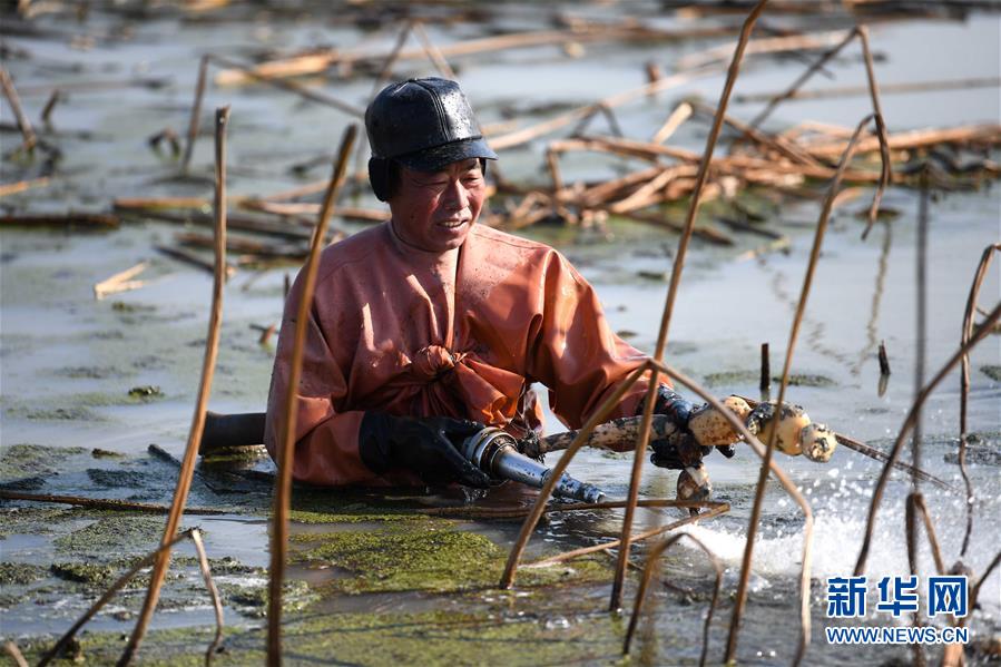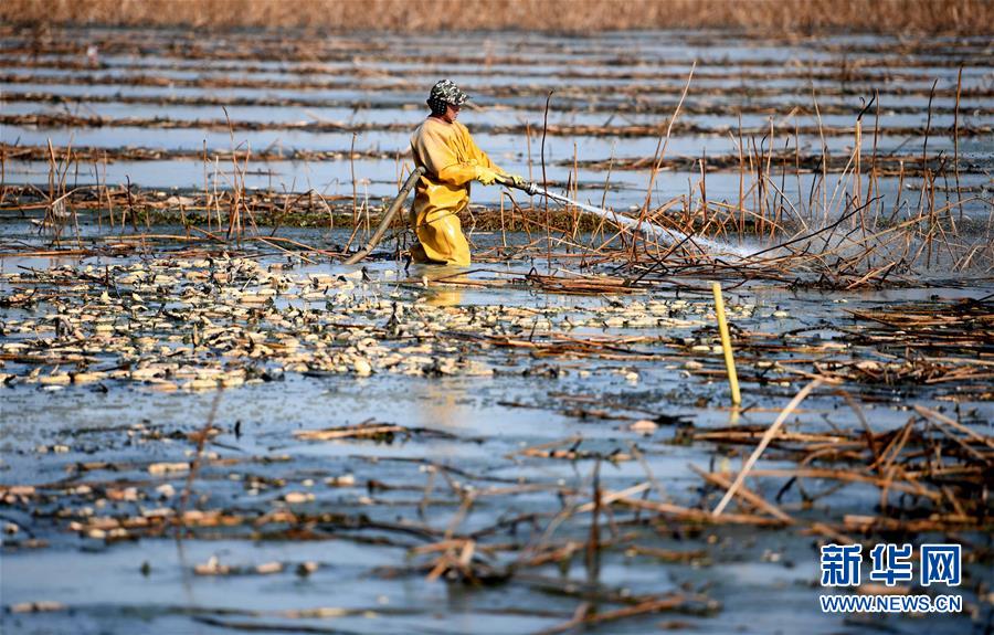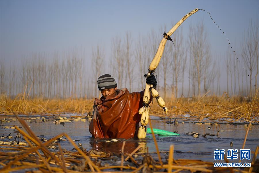 寒冬時(shí)節(jié),白洋淀里依然活躍著不少挖藕人,他們身穿橡膠工作服,在冰冷的水中辛勤工作。