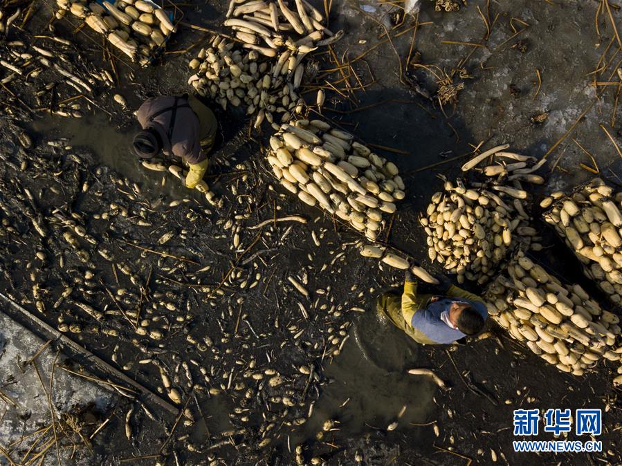 1月31日,在雄安新區(qū)安新縣東向陽村的一處藕塘,挖藕工將挖出來的藕洗干凈后裝車運(yùn)走。新華社記者沈伯韓攝