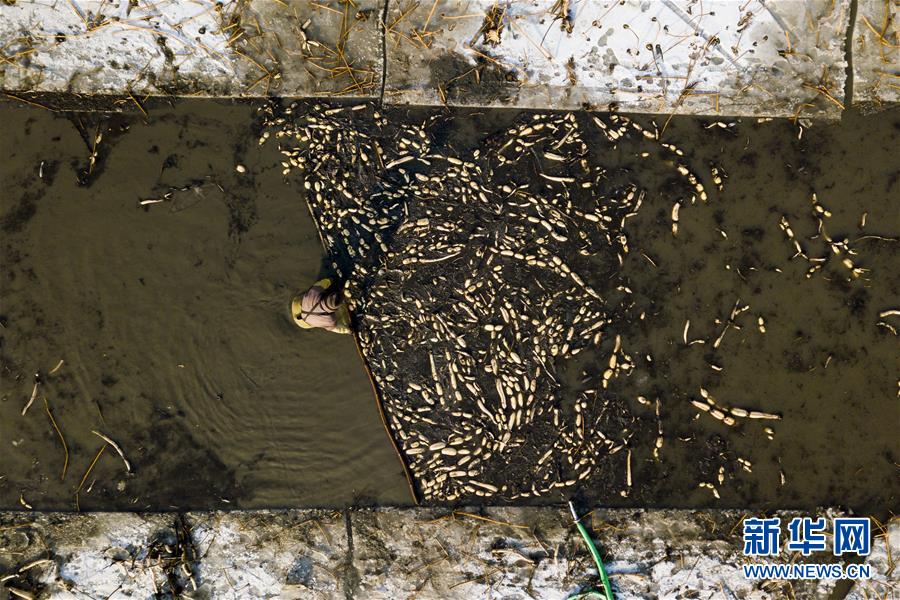 1月31日,在雄安新區(qū)安新縣東向陽村的一處藕塘,挖藕工清洗挖出來的藕(無人機(jī)航拍)。新華社記者沈伯韓攝