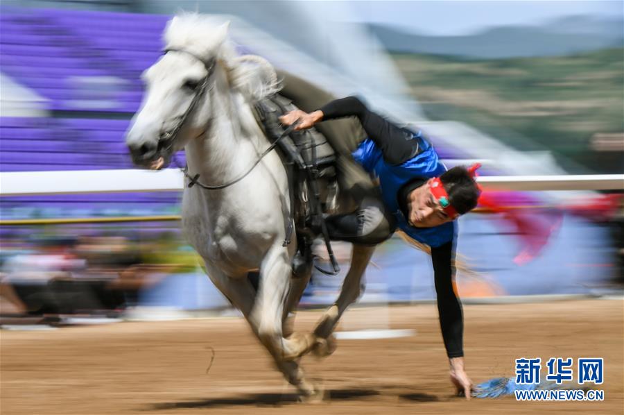 8月20日,騎手在“蒙古馬”傳統(tǒng)技巧表演中展示騎馬拾哈達(dá)。 新華社記者 彭源 攝