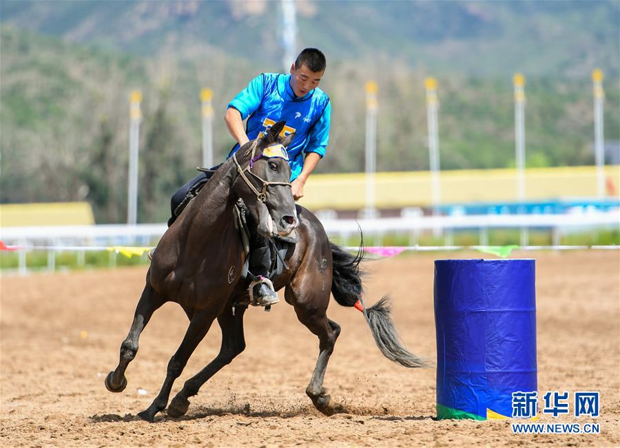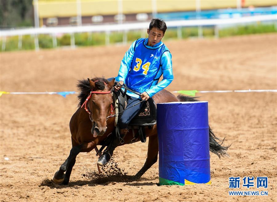 8月20日,騎手在“蒙古馬”傳統(tǒng)技巧表演中展示騎馬繞桶。  新華社記者 彭源 攝