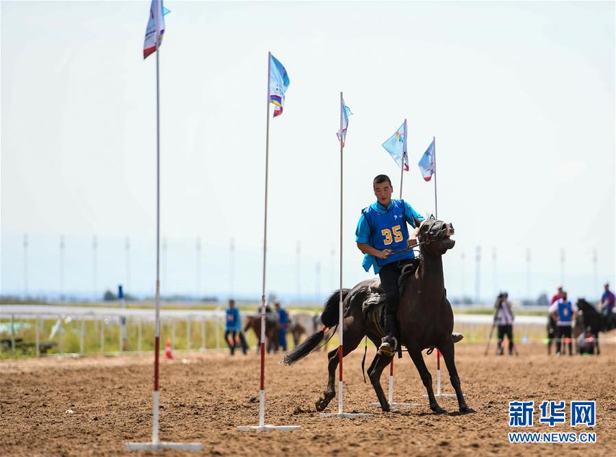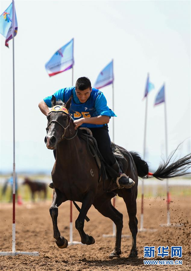 8月20日,騎手在“蒙古馬”傳統(tǒng)技巧表演中展示騎馬穿樁。  新華社記者 彭源 攝