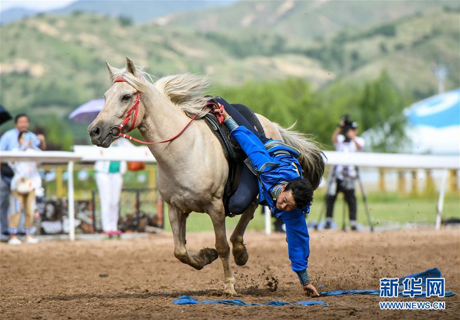 8月20日,騎手在“蒙古馬”傳統(tǒng)技巧表演中展示騎馬拾哈達(dá)。  新華社記者 彭源 攝
