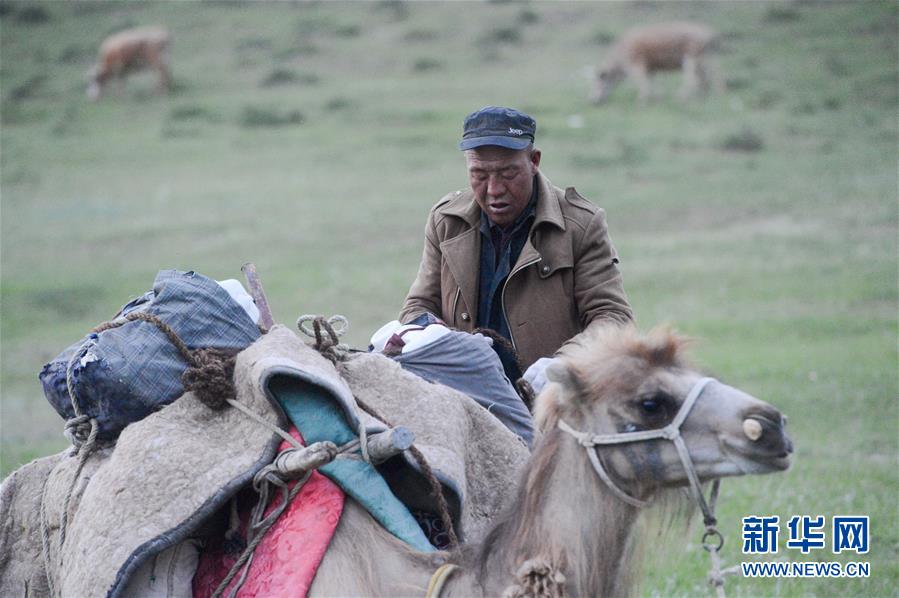 6月6日,新疆阿勒泰地區(qū)福??h牧民帶著駝隊行進在轉(zhuǎn)場途中。 新華社記者 丁磊 攝