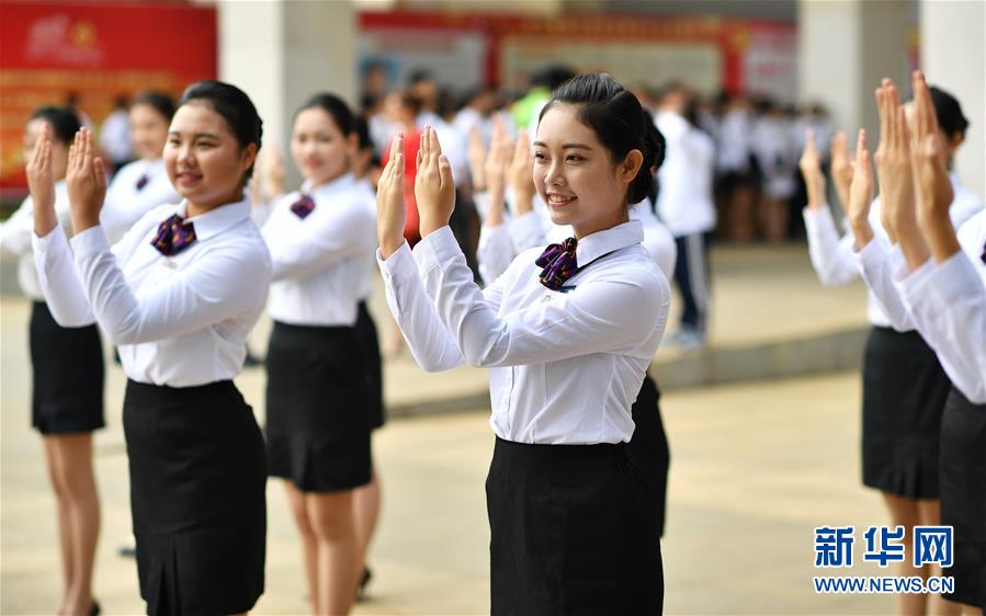 海南省旅游學(xué)校禮儀隊(duì)的學(xué)生在上禮儀課(2018年4月20日攝)。新華社記者郭程攝