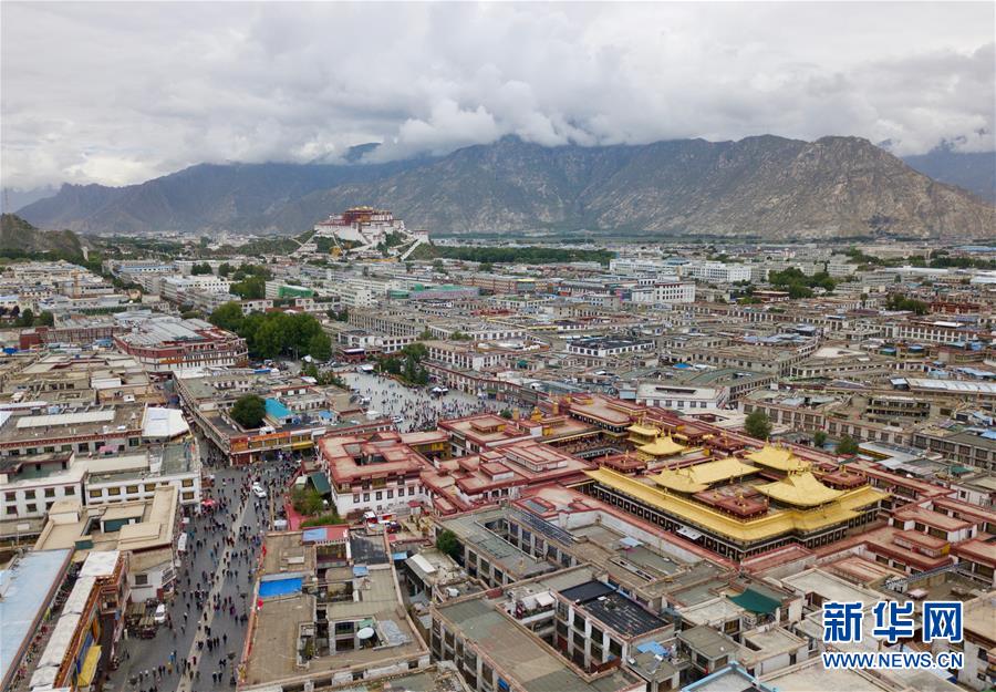 8月10日無人機拍攝的大昭寺和遠(yuǎn)處的布達拉宮。新華社記者 侯東濤 攝
