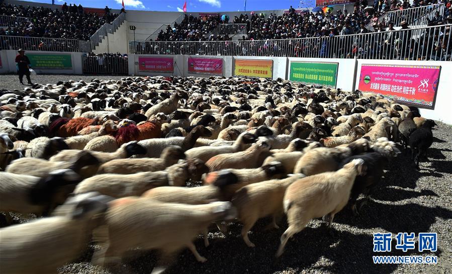 9月9日,羊群在進(jìn)入場(chǎng)地時(shí)牧民撒青稞祈福。李鑫 攝
