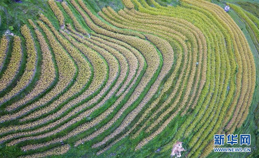 這是9月17日無(wú)人機(jī)拍攝的貴州省榕江縣計(jì)劃鄉(xiāng)計(jì)劃村陽(yáng)開苗寨梯田。 近日,貴州省黔東南苗族侗族自治州榕江縣計(jì)劃鄉(xiāng)計(jì)劃村陽(yáng)開苗寨的水稻陸續(xù)成熟,農(nóng)民們搶抓農(nóng)時(shí)收割稻谷。從空中俯瞰,層層疊疊的梯田線條分明,與古樸的苗寨木樓相互映襯,美不勝收。 新華社記者 楊文斌 攝