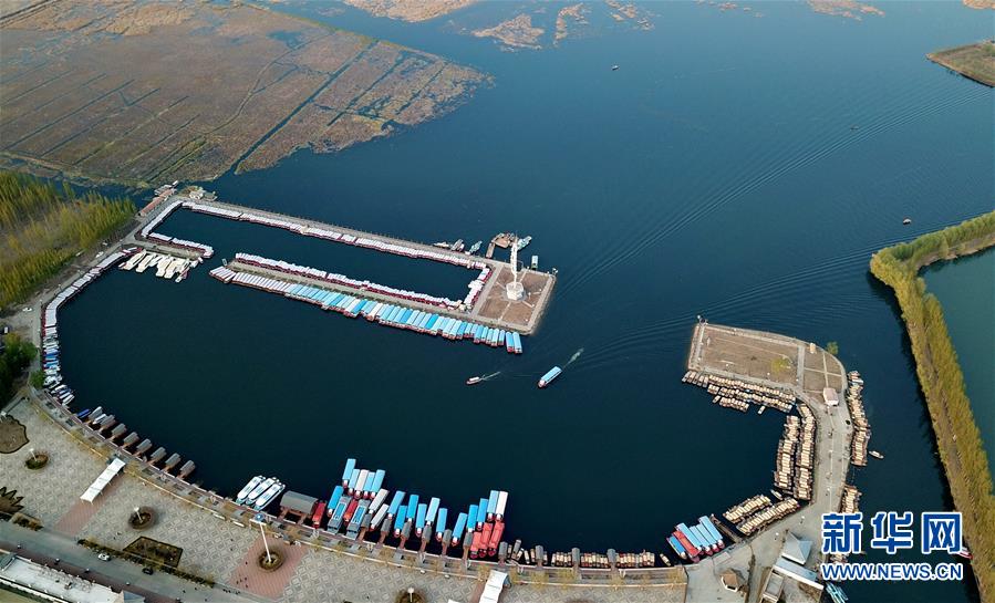游船在白洋淀旅游碼頭內(nèi)行駛(4月10日無(wú)人機(jī)拍攝)。新華社記者牟宇攝