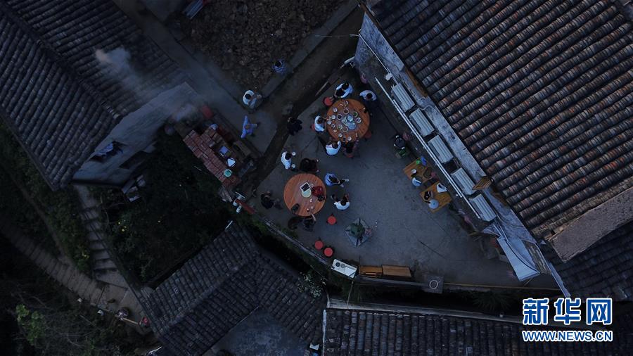 游客在木梨硔村吃早點(diǎn)(9月18日無(wú)人機(jī)拍攝)。新華社記者張端攝