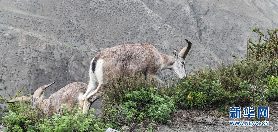 一群巖羊在西藏山南市洛扎縣色鄉(xiāng)海拔4000米左右的盤山路邊,悠閑地吃著野果青草(9月22日攝)。 新華社記者 晉美多吉 攝