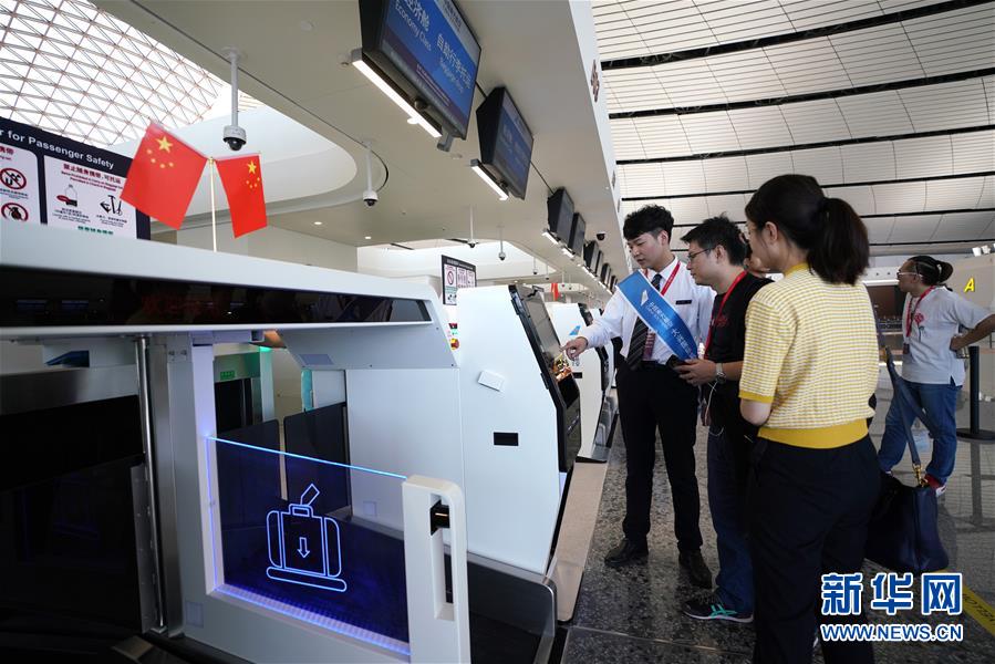 9月25日,中國(guó)南方航空公司工作人員(左)在北京大興國(guó)際機(jī)場(chǎng)介紹自助行李托運(yùn)設(shè)備。新華社記者鞠煥宗攝