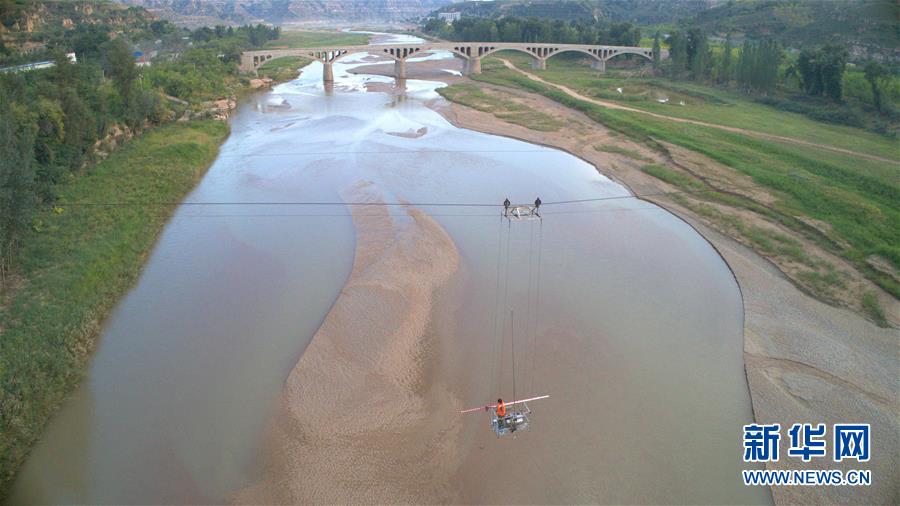 溫家川水文站站長鄭威在窟野河取沙(9月7日攝)。新華社記者劉詩平攝