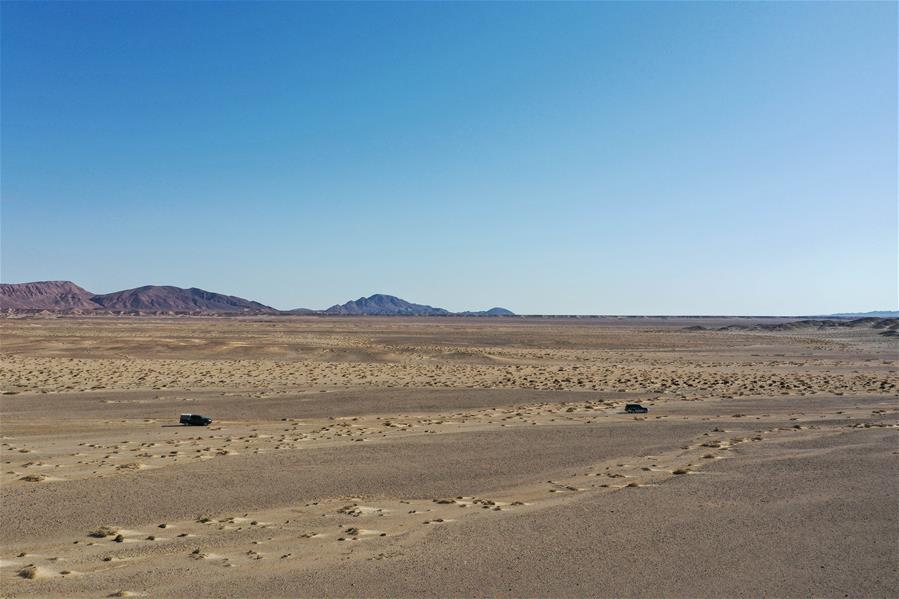 9月25日,內(nèi)蒙古自治區(qū)額濟納旗算井子邊境派出所的民警開車對轄區(qū)進行巡護(無人機拍攝)。新華社記者劉磊攝