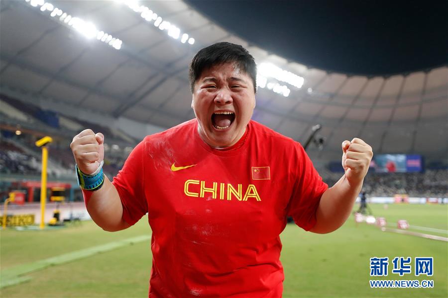 當日,在卡塔爾多哈舉行的2019國際田聯(lián)世界田徑錦標賽女子鉛球決賽中,衛(wèi)冕冠軍、中國選手鞏立姣以19米55的成績奪得冠軍。 新華社記者王麗莉攝