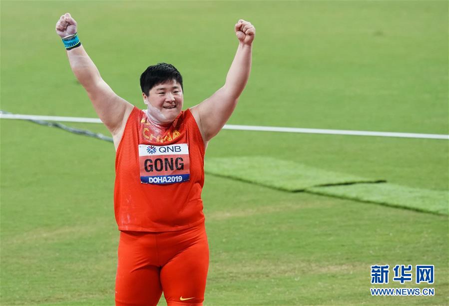 當日,在卡塔爾多哈舉行的2019國際田聯(lián)世界田徑錦標賽女子鉛球決賽中,衛(wèi)冕冠軍、中國選手鞏立姣以19米55的成績奪得冠軍。 新華社記者王婧嬙攝