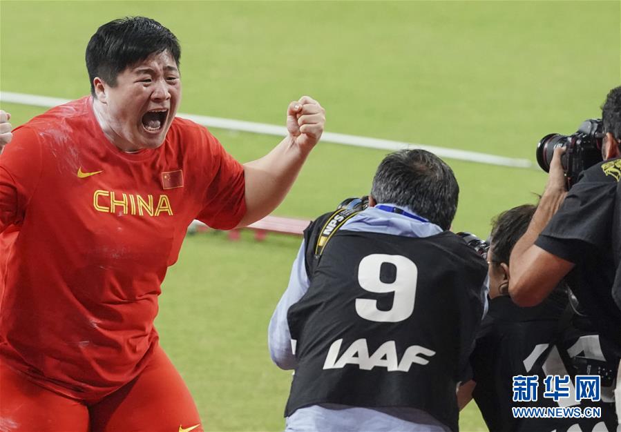 當(dāng)日,在卡塔爾多哈舉行的2019國際田聯(lián)世界田徑錦標(biāo)賽女子鉛球決賽中,衛(wèi)冕冠軍、中國選手鞏立姣以19米55的成績奪得冠軍。 新華社記者王婧嬙攝