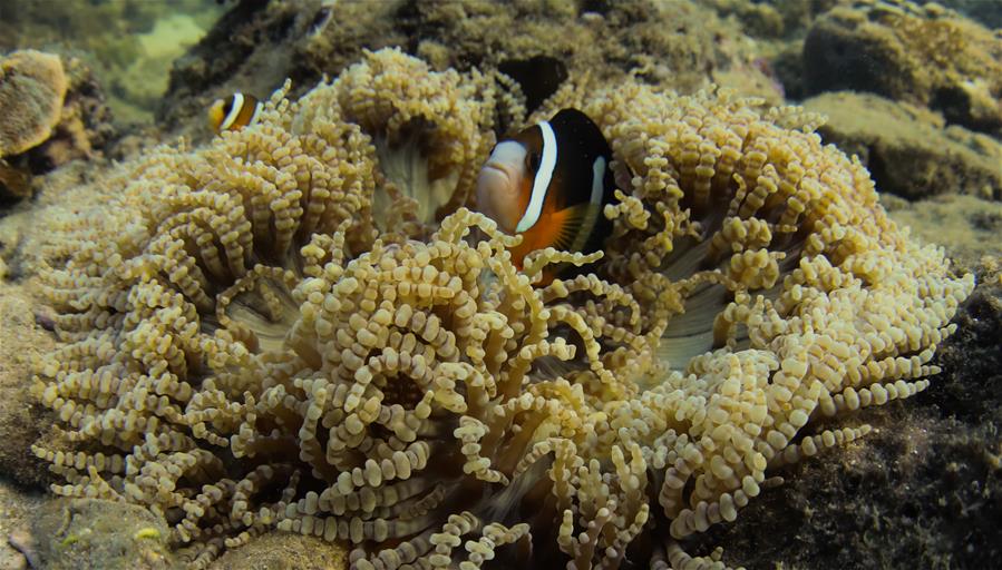 在分界洲島海域,小丑魚在海葵中游動(10月4日攝)。