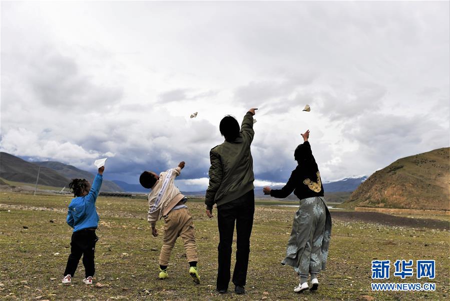 堅熱益西(右二)在牧區(qū)和弟弟妹妹一起放飛紙飛機(7月13日攝)。新華社記者普布扎西攝