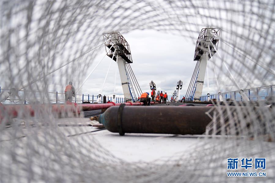 工人在大橋上進行橋面鋪裝施工作業(yè)(8月19日攝)。新華社記者王建威攝