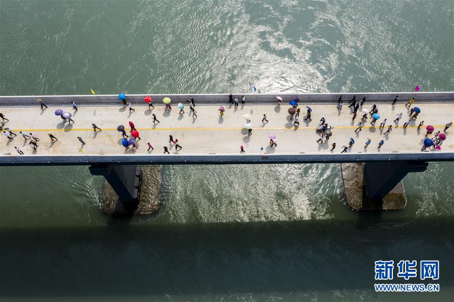 10月12日,福建省霞浦縣東安島海防大橋正式通車,這是當?shù)厝罕娮咴谛聵蛏希o人機拍攝)。新華社記者姜克紅攝