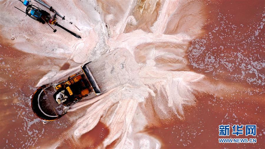 魯北鹽場工人在鹽池中收獲海鹽(10月9日無人機(jī)拍攝)。新華社記者 朱崢 攝