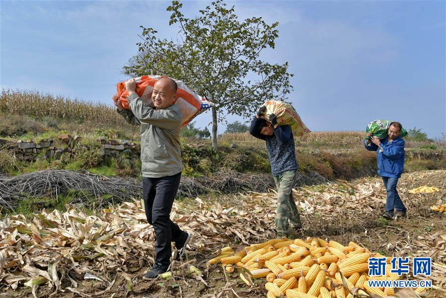 在奪火鄉(xiāng)高谷堆村,第一書(shū)記侯俊國(guó)(左)在幫助村民收玉米(10月13日攝)。 新華社記者 曹陽(yáng) 攝
