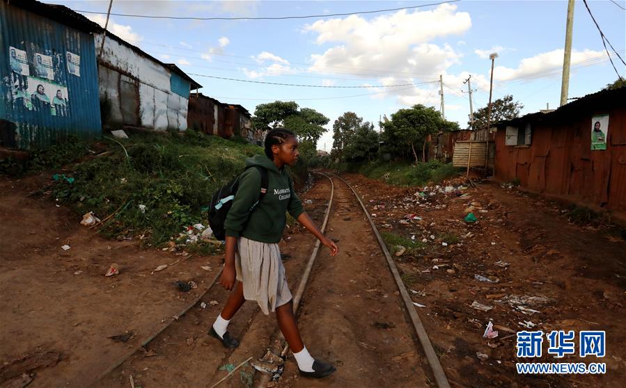 10月16日,在肯尼亞內(nèi)羅畢基貝拉貧民窟,一名學(xué)生走過鐵軌。新華社記者王騰攝